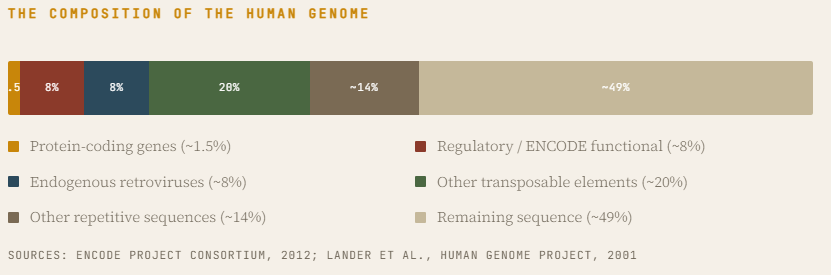 And then there is the evolutionary residue baked into the sequence itself. Your genome is not a clean blueprint. It is a palimpsest — layer upon layer of evolutionary history, including the remnants of ancient viral infections. Approximately 8% of the human genome consists of endogenous retroviruses (ERVs): sequences from retroviruses that infected our ancestors millions of years ago, copied themselves into the germline, and have been passed down ever since. Some of them have been co-opted for essential biological functions. Your placenta, for instance, partially relies on proteins derived from ancient viral genes. The line between “us” and “them” at the molecular level is not a line at all.