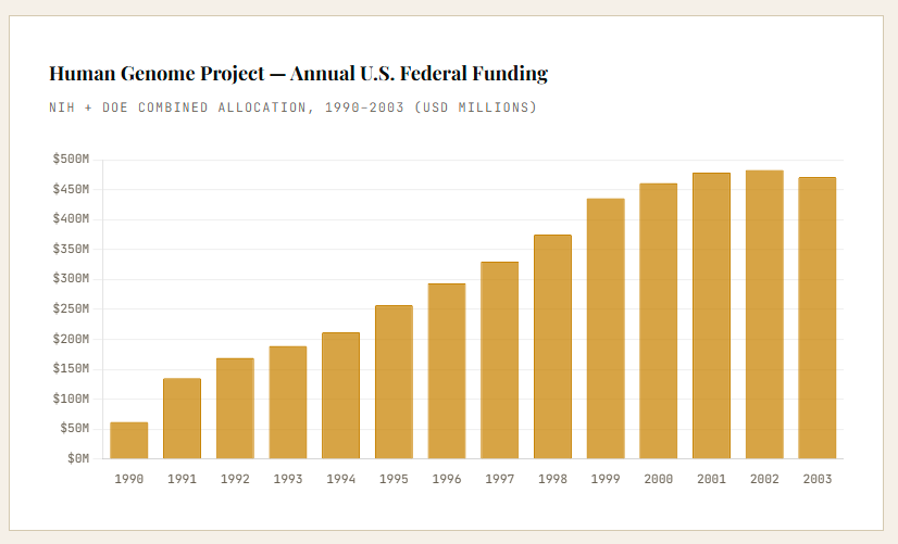 The $3 billion figure was itself a political calculation. Congressional appropriators needed to believe the number before they would appropriate anything at all. The project’s architects — James Watson, initially, then Francis Collins after Watson’s controversial departure in 1992 — had to sell the idea that mapping human genetic information was worth sustained public investment. This was not obvious to everyone in 1990.