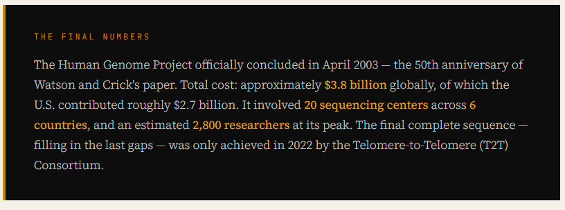 The project was formally launched in 1990, a collaboration among the U.S. National Institutes of Health, the Department of Energy, and international partners across the U.K., France, Germany, Japan, and China. The stated goal: sequence the entire human genome by 2005, at a cost of $3 billion. It was called the Apollo program of biology — and the comparison was apt both in ambition and in the way it forced technological innovation as a precondition for success.