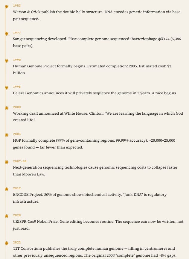 Notice what is happening in that timeline. Each major milestone does not close a chapter. It opens a new one, usually larger than the last. The 2003 completion didn’t end genomics research — it started it. The 2012 ENCODE results didn’t explain the non-coding genome — they revealed that the non-coding genome has its own complexity, its own regulatory logic, that we had missed entirely. The 2022 complete genome revealed that our “complete” sequence from 2003 was missing 8% of itself — specifically the centromeres and other repetitive regions that proved too difficult to assemble with older technologies.