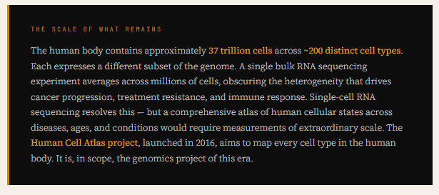 The question is no longer what does the sequence say. The question is what does the system do, and why. And to answer that question, we need to measure not just the DNA — but the RNA. All of it. In every cell type. Under every condition. Over time. That is a different problem by orders of magnitude.