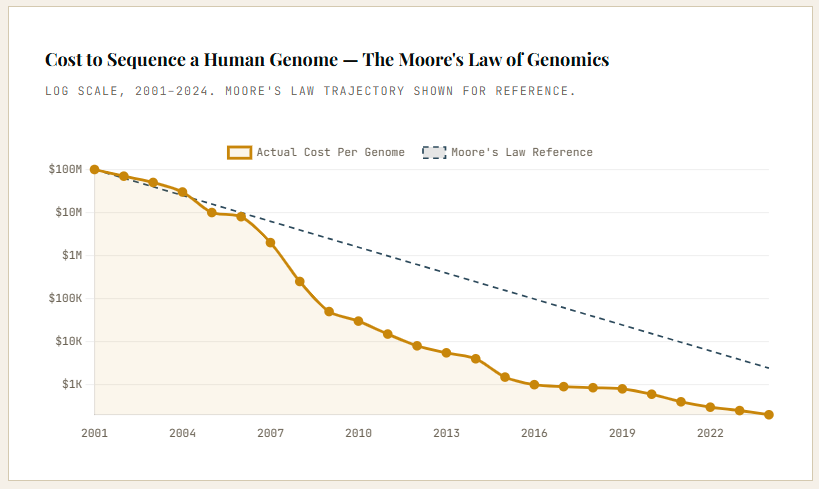 The graph above shows something remarkable: genomic sequencing costs fell faster than Moore’s Law. The introduction of next-generation sequencing technologies around 2007–2008 caused a cliff — a discontinuous collapse that the semiconductor industry’s regular doubling never achieved. By 2024, a whole human genome can be sequenced for approximately $200. The trajectory points toward $100 within the next few years. We are approaching a world where routine genomic sequencing is cheaper than many blood panels.
