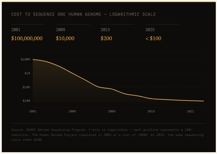Source: NHGRI Genome Sequencing Program. Y-axis is logarithmic — each gridline represents a 100× reduction. The Human Genome Project completed in 2003 at a cost of ~$50M. By 2025, the same sequencing costs under $100.