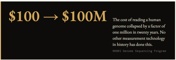 The cost curves are genuinely staggering. Whole genome sequencing cost $3 billion when the Human Genome Project completed in 2003. It is now under $100.[1] RNA sequencing costs have followed a similar trajectory. The tools of molecular observation are approaching something like Moore’s Law.