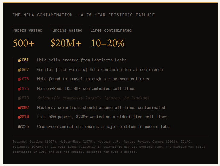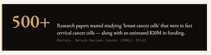 For decades, researchers around the world believed they were studying breast cancer cells, lung cancer cells, liver cells. Many were studying HeLa — the cervical cancer cells from Henrietta Lacks, which had contaminated their cultures and outcompeted everything else in the dish.