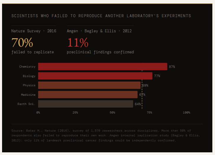 Amgen’s internal replication effort found that only 11% of landmark preclinical cancer findings could be independently confirmed.[3] An estimated $28 billion per year is spent in the US alone on preclinical research that cannot be reproduced.[6]