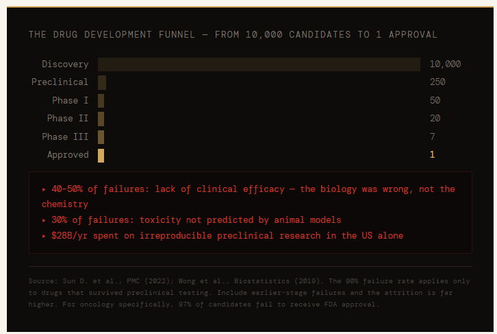 Nine out of ten drug candidates that enter Phase I clinical trials fail.[4] And that 90% failure rate only counts drugs that already survived preclinical testing. Include earlier attrition and the figure is far worse. For oncology specifically, 97% of drugs fail to receive FDA approval.[5]