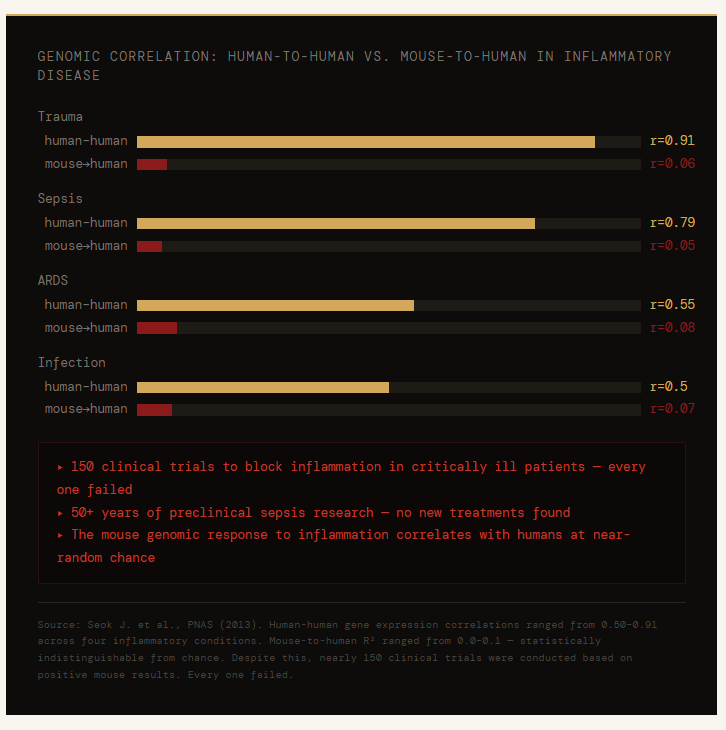 A landmark 2013 paper in PNAS finally explained why.[7] Among genes changed significantly in human inflammatory disease, the mouse gene responses correlated with human responses at an R² between 0.0 and 0.1. In plain terms: the genomic response of mice to inflammation matches the human response with the accuracy of random chance.